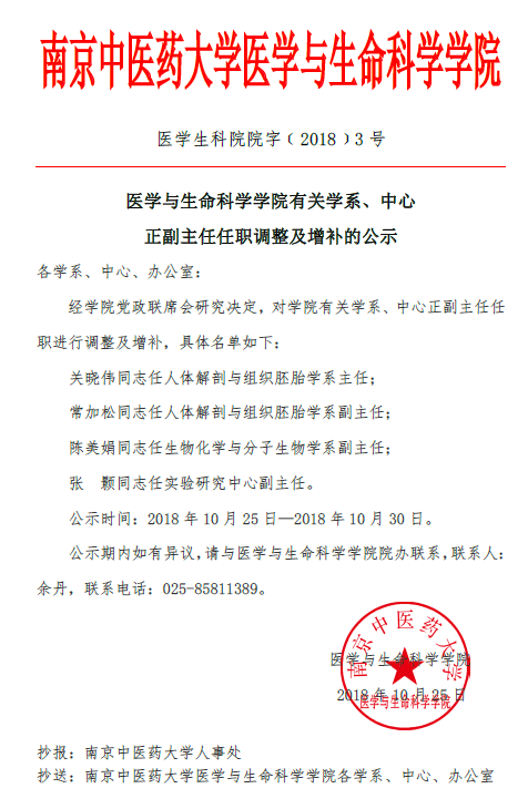 医学与生命科学学院有关学系、中心正副主任任职调整及增补的公示