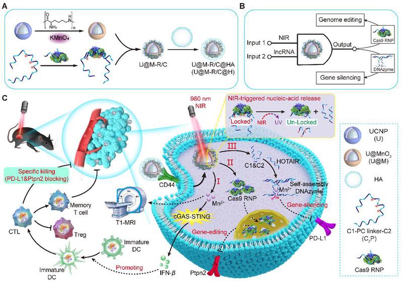 该研究构建了一种近红外光激活上转换纳米核酸药物用于递送Cas9 RNP/DNAzyme逻辑门系统为肿瘤精准基因疗法提供了新思路。此纳米药物以锰修饰的上转换纳米颗粒为核心,通过静电吸附搭载Cas9 RNP和DNAzyme逻辑系统,并在外层包裹透明质酸提升靶向性。其核心创新在于巧妙设计的光控双基因调控机制——近红外光(980 nm)触发下,纳米核酸药物释放Cas9 RNP精准编辑Ptpn2基因,同时利用内源性lncRNA(HOTAIR)自组装形成DNAzyme系统,特异性沉默PD-L1基因,实现免疫检查点的双重阻断。更关键的是,释放的Mn2+不仅能作为DNAzyme的催化辅助因子,还能激活cGAS-STING信号通路,并通过T1-MRI实现诊疗一体化。这一突破通过时空可控的基因编辑与免疫调控协同作用,为实体瘤系统性免疫治疗提供了高效低毒的新策略。
