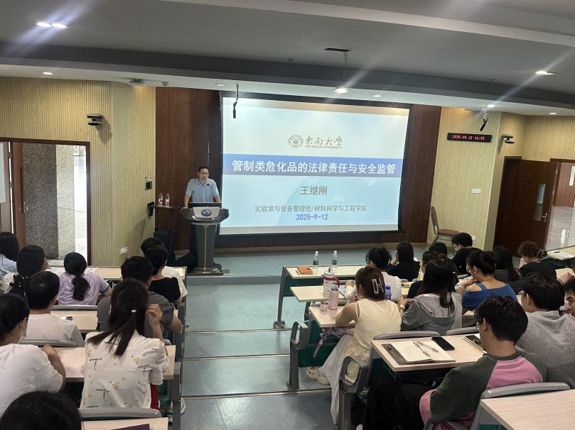 为进一步加强实验室安全管理,提升研究生对危险化学品的规范使用意识,规范科研实验操作,9月12日下午,金沙集团1862cc成色在B7-102报告厅举办《管制类危化品的法律责任与安全事项》主题讲座。本次讲座特邀东南大学实验室与设备管理处副处长、材料科学与工程学院教授王继刚担任主讲,学院全体研究生参加讲座,党委副书记、副院长郁祥主持讲座。